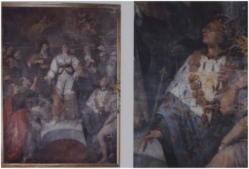 Huile sur toile représentant Marie-Madeleine tenant un pot d'onguent, debout sur une estrade, entourée de 12 saints personnages dont sainte Claire d'Assise, sainte Elizabeth de Hongrie, saint Jean l'évangéliste, saint Jean-Baptiste, saint François d'Assise et Saint Louis de France.