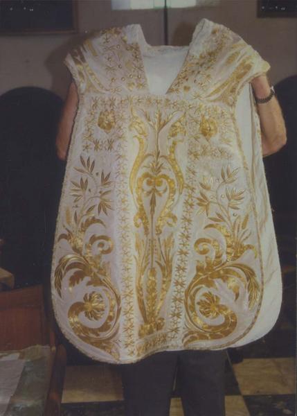 Chasuble en satinette blanche lamée or, à motifs de rinceaux feuillagés, de frise de fleurettes et d'étoiles, de feuilles d'acanthe, d'épis de blé et des armes du cardinal.