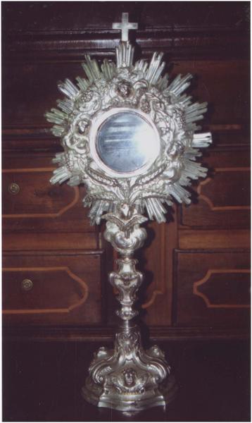 Arrêté : Ostensoir en argent repoussé et ciselé, portant pampres et épis, nuées et quatre têtes d'angelots sur la gloire rayonnante, 1757, H. 57, 1, La. 25, 5, Di. pied 15, 1 cm.