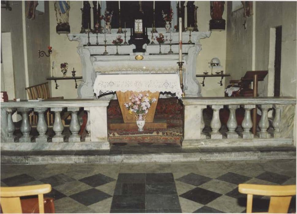 Barrière de communion à balustres en deux éléments séparés, chacun comportant quatre balustres pleins et deux demi-plaques sur les piliers rectangulaires.