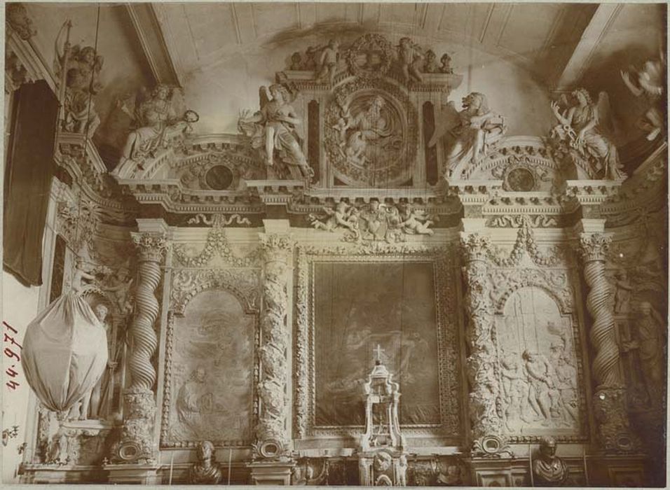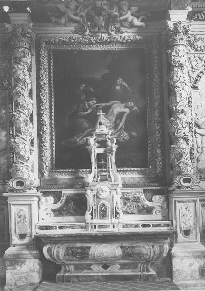 Retable du maître-autel en stuc, exécuté par Jean Sabatier et restauré en 1818, orné d'un tableau central représentant une Descente de Croix. Au centre du maître-autel : la Descente de Croix, toile attribuée à Nicolas Mignard, selon un modèle de Carrache.