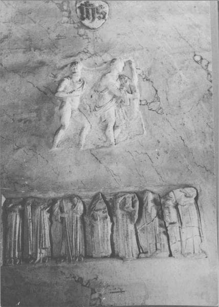 2 bas-reliefs : deux personnages antiques, procession de moines