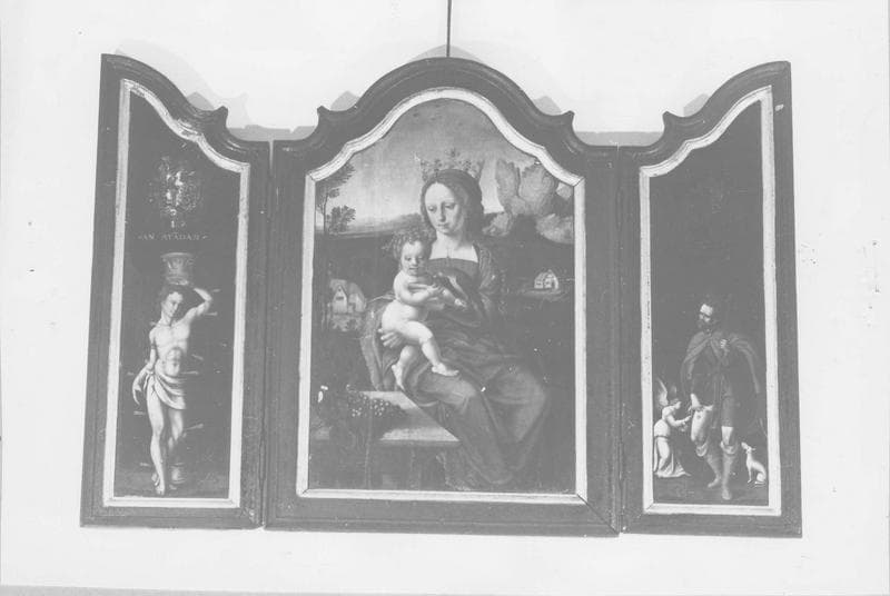 3 tableaux (triptyque) : la Vierge et l'Enfant avec un perroquet, saint Sébastien et saint Roch