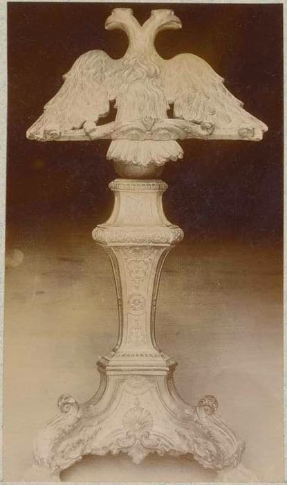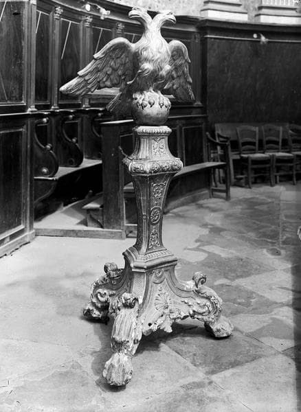 Trépied en pattes de lion gainées d'une feuille d'acanthe, façades ornées de coquille. Fût triangulaire évasé vers le haut, timbré de palmettes et rouelle ; fût sommé d'un aigle à deux têtes posé sur une sphère ; les ailes et la queue déployées servent de support au livre.