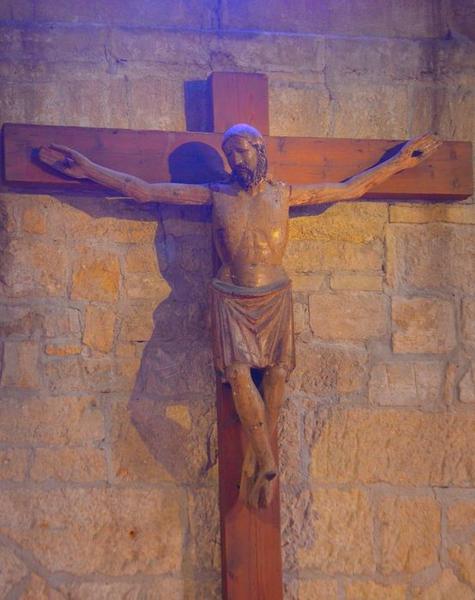 Tête légèrement tournée vers la droite, yeux clos, cheveux longs, barbe et moustache à boucles symétriques, perizonium retenu sur les hanches par un pli en bourrelet et descendant jusqu'aux genoux en tablier à plis cassants en V ; torse droit, bras étendus à l'horizontale, coudes légèrement ployés, mains franchement ouvertes, corps criblé de blessures, front meurtri par la couronne d'épines, large fente au côté droit, pieds superposés, le gauche relevé comme pour s'appuyer sur un suppedaneum (disparu avec la croix originale) ; polychrome