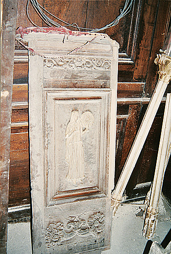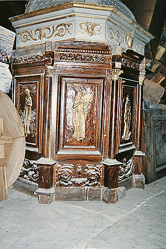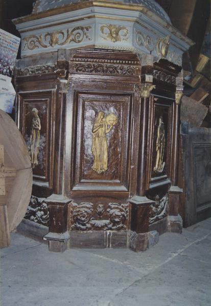 Panneaux de la cuve, plaquée de relief en carton-pierre. Petite balustrade sur l'abat-voix.