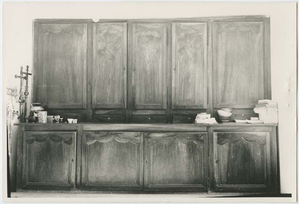 Meuble de sacristie en bois de noyer composé de deux parties. La partie inférieure comporte une porte à droite, une à gauche et au centre, une porte à deux battants avec à l'intérieur des tiroirs pour vêtements sacerdotaux. La partie supérieure comporte une porte centrale à deux battants et une porte à droite. A chacune des extrémités se trouve un panneau faisant fausse porte. Entre les deux parties du meuble se trouvent trois tiroirs avec des anneaux en métal.