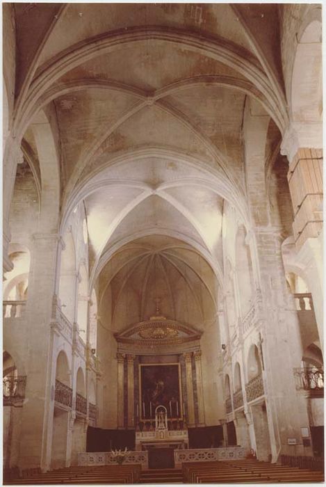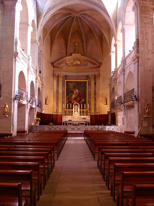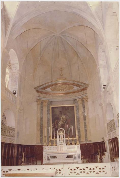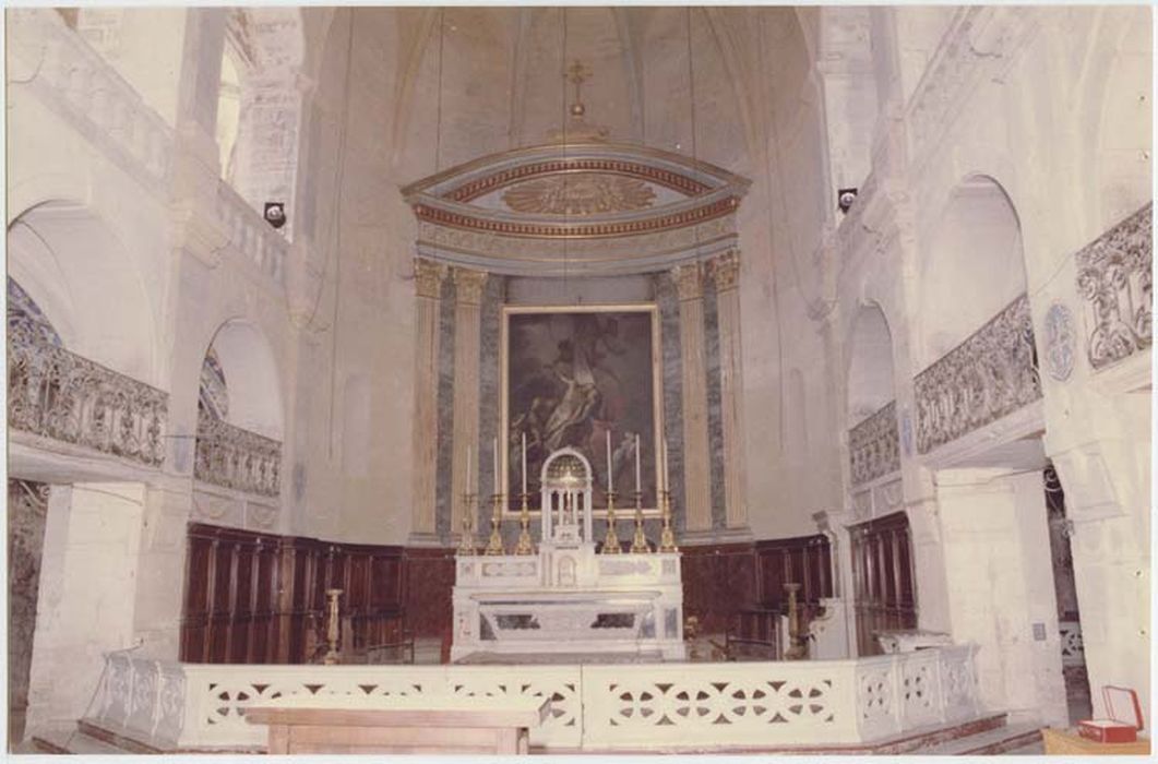 Arrêté : choeur : ensemble comprenant notamment : Maître-autel à degrés, marbre polychrome, par Marietty, 1827, six candélabres et un crucifix métal doré, retable bois peint et doré XIXe siècle, descente de croix, toile XIXe siècle, lambris et stalles bois XIXe siècle, deux torchères bois doré XIXe siècle, table de communion marbre blanc XIXe siècle.