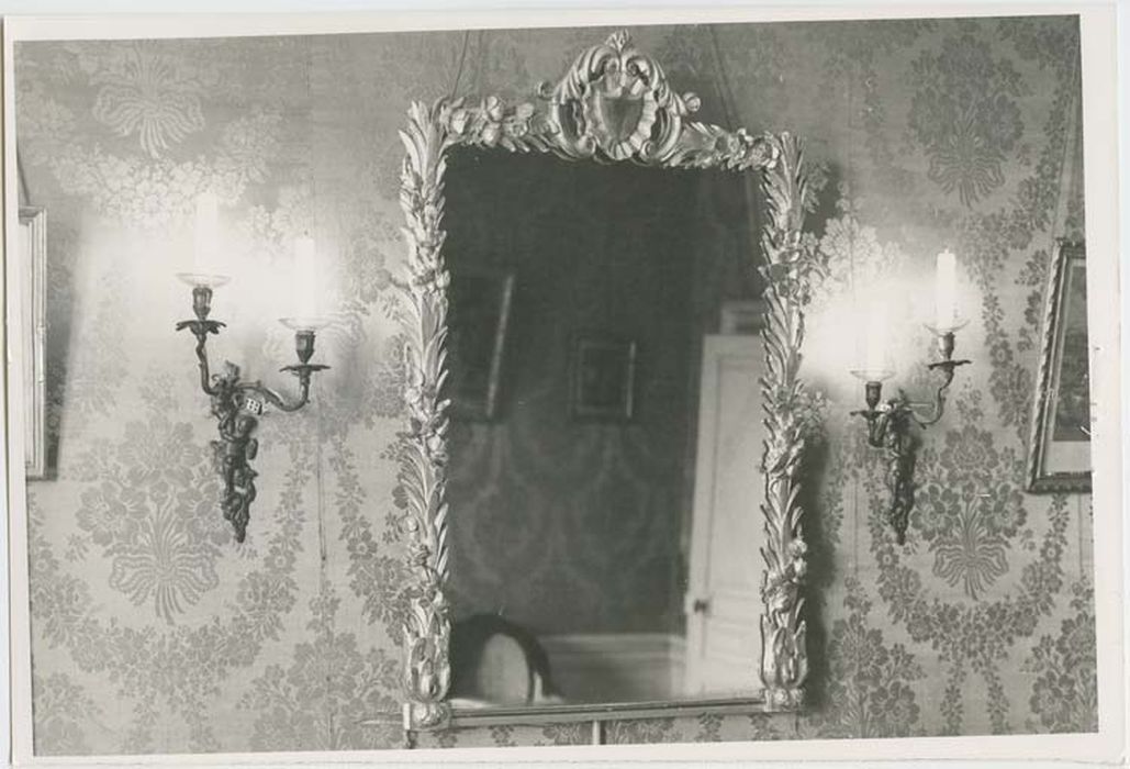 Petite glace dans un cadre en bois redoré à décor de fleurs.
