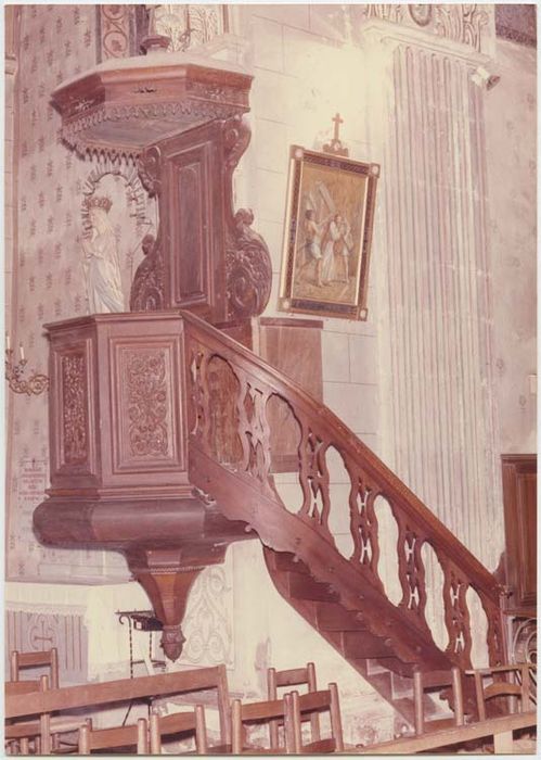 Chaire à prêcher en bois de châtaignieravec un escalier et un abat-voix.