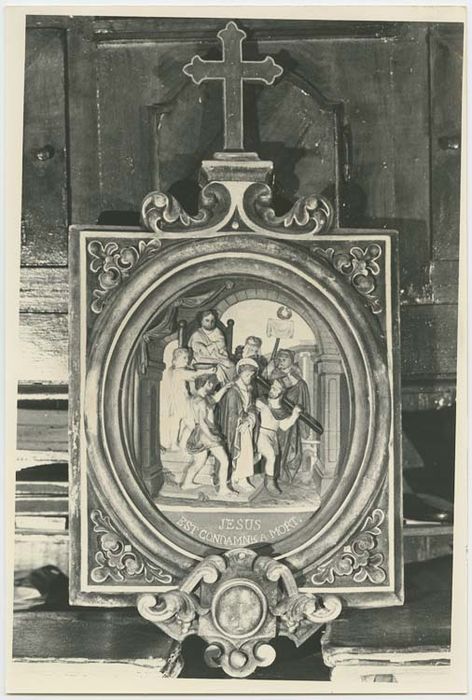 Chemin de croix en terre cuite polychrome constitué de 14 stations. Chaque station est composée d'un cadre en bois surmonté d'une croix dans lequel se trouve en médaillon ovale une scène en terre cuite.