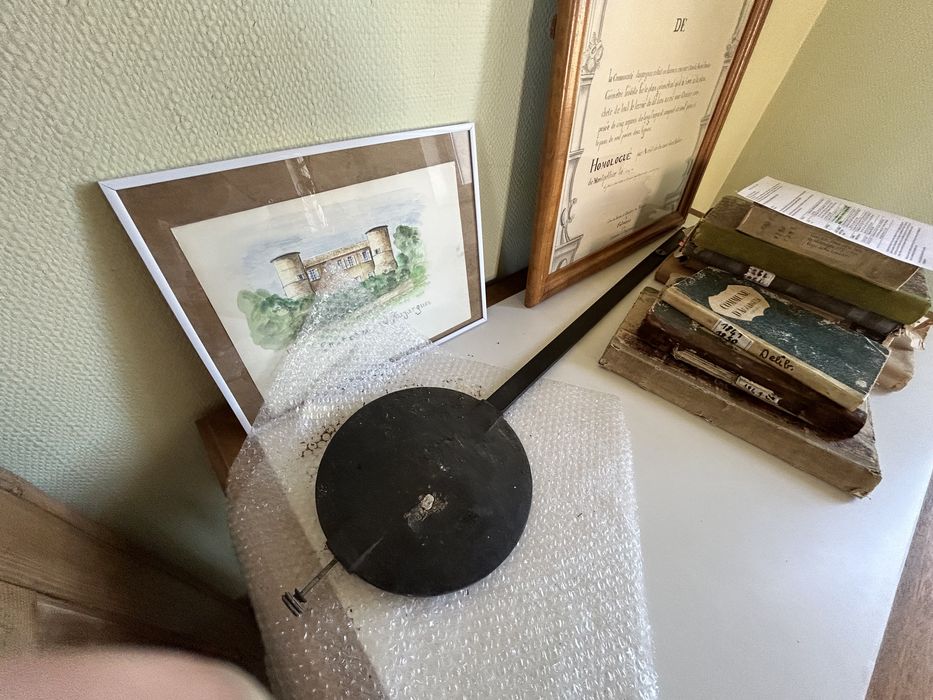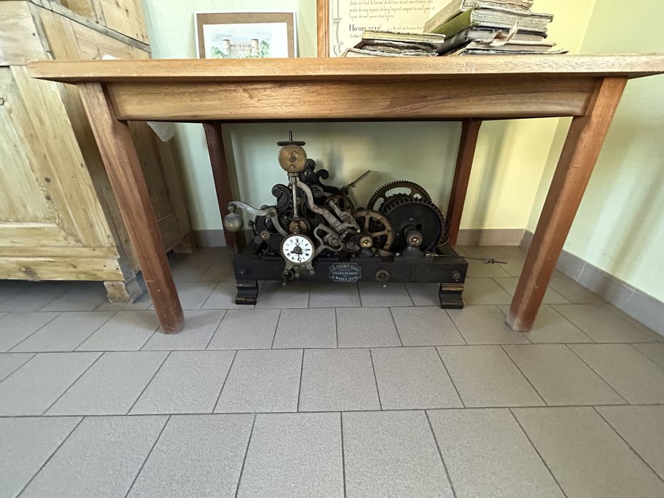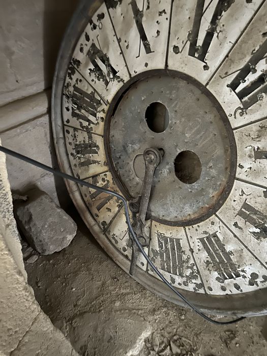 Le mécanisme est déposé dans la salle du conseil municipal ; sa caisse est toujours en place au sommet de l'escalier d'accès au toit de l'église ; les poids sont sous cet escalier.