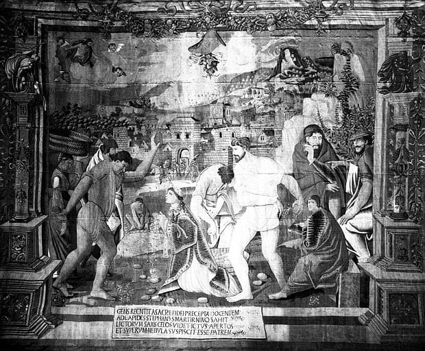 pièce murale : Lapidation de saint Etienne (tenture composée de la Remise des clefs à saint Pierre, la Lapidation de saint Etienne, un Miracle de saint Paul)