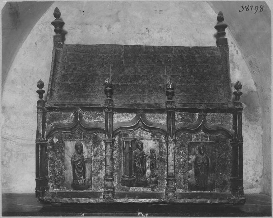 Châsse faite de plaques de cuivre argenté sur âme de bois.