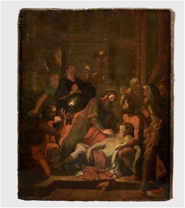 Jean-Jacques Courtin (1672-1752). Ce tableau est le dernier May de la cathédrale Notre-Dame de Paris. Il fut donné par Louis XVIII à Toulouse en 1829. J.-F. Courtin, élève de Louis Boulogne le Jeune, exposa régulièrement dans les Salons de 1737 à 1751. Cette toile a été commandée par la corporation des orfèvres de Paris dans le cadre des Mays. Cette habitudes d'offrir chaque année des toiles à la cathédrale Notre-Dame, le 1er mai est né en 1630. Chaque année, les orfèvres ont commandé des toiles de grandes dimensions destinées à orner les piliers de Notre-Dame de Paris. Les sujets devaient être obligatoirement être tirés des Actes des Apôtres. Les plus grands artistes ont été mis à contribution : 76 toiles ont été commandées et accrochées jusqu'en 1707. La toile de Courtin fait donc partie de la dernière livraison. En 1791, les Mays ont été confisqués et dirigés vers le Museum des Arts - le Louvre -, après le Concordat, elles ont été dispersées. C'est ainsi que ce tableau est arrivé à Toulouse en 1829.