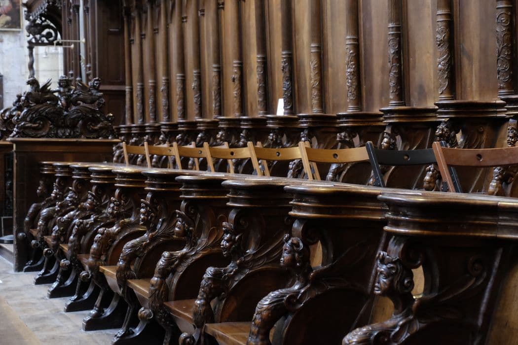 Stalles à dossier haut. Chaque travée est marquée chacune par une arcature moulurée et cintrée au sommet. L'ensemble est cadencé de pilastres plats et surmonté d'une corniche dentelée. La tablette est marquetée. Un mécanisme sous le plateau permet de soulever une sculpture.