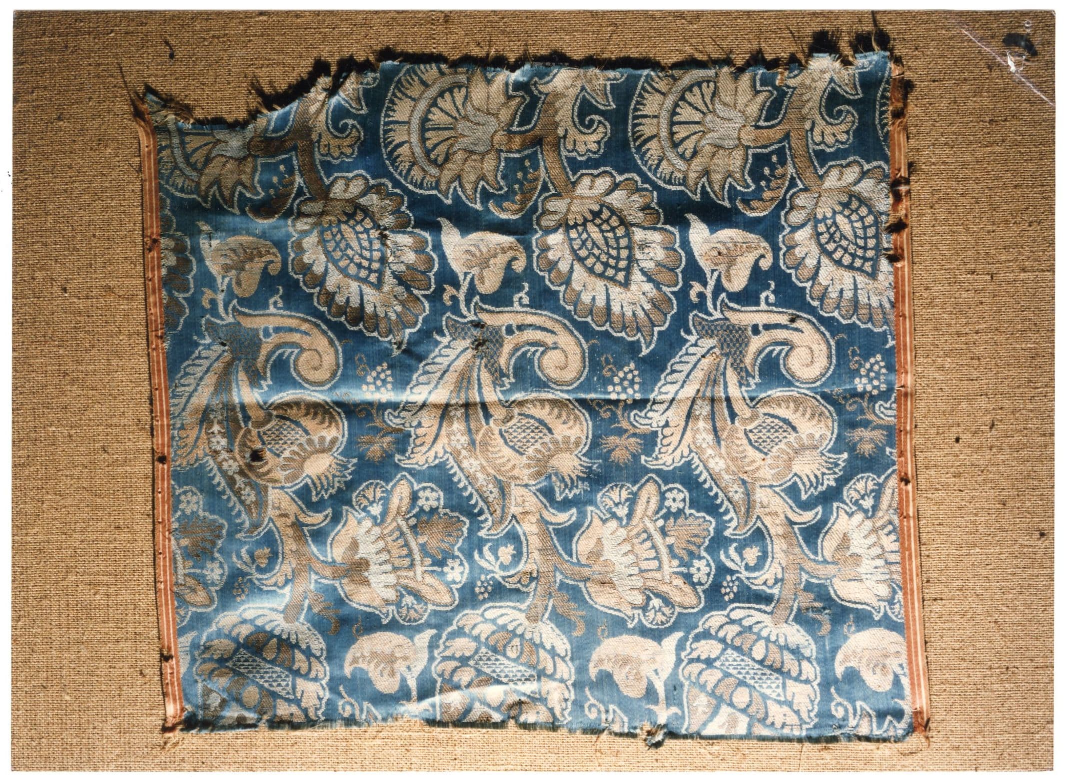 Coffre en bois présentant sur chaque face une niche cintrée arasée. La face supérieure est munie d'un volet à deux charnières, fermé par deux serrures. Le volet est protégé par une barre de fer plate qui s'incruste dans un anneau. Autour de ce volet, huit emplacements pour les sceaux de cire. Les parois présentent de nombreux trous correspondant à la fixation des anciens revêtements d'argent doré. Les lettres sont des repères d'assemblage. A l'intérieur, soie à fond bleu et motifs de rinceaux de fleurs et de fruits roses et jaunes.