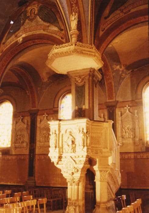 Chaire en grès cérame, matériau également utilisé pour le porche réalisé par Virebent (PM31001697). Inspiration médiévale italienne dans le traitement des statuettes, des colonnes et des chapiteaux, avec une décoration géométrique en méplat.