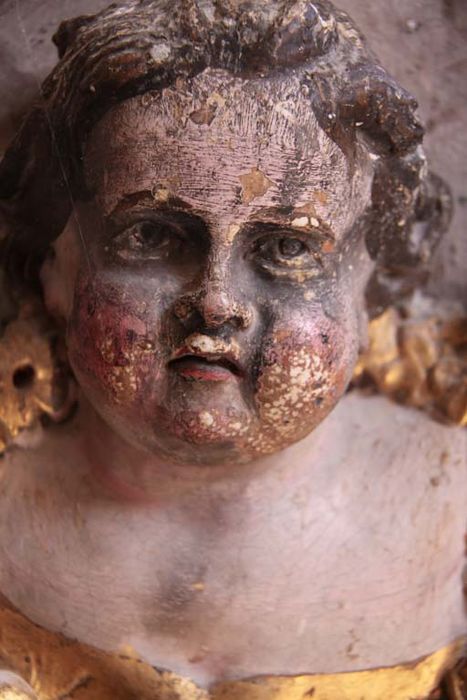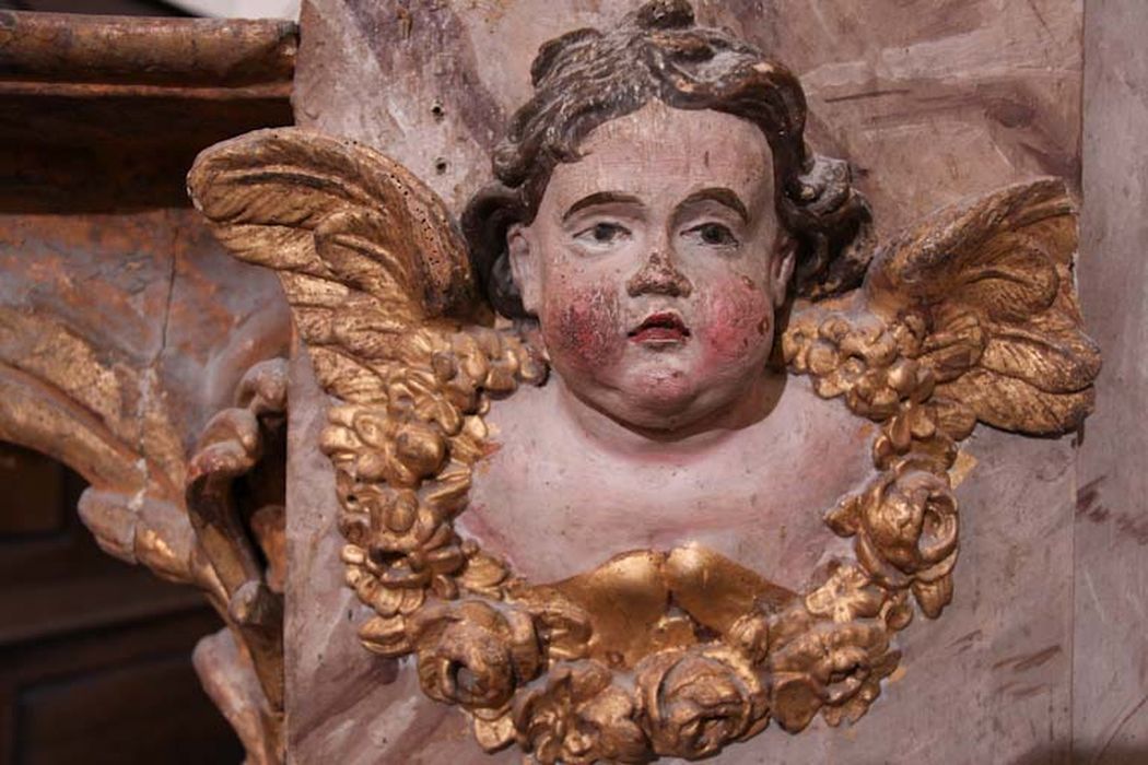 médaillon : motif rocaille ; guirlande : fleur ; angelot : tête ; ange : prière ; Coeur Sacré de Jésus ; chute végétale : feuillage ; croix