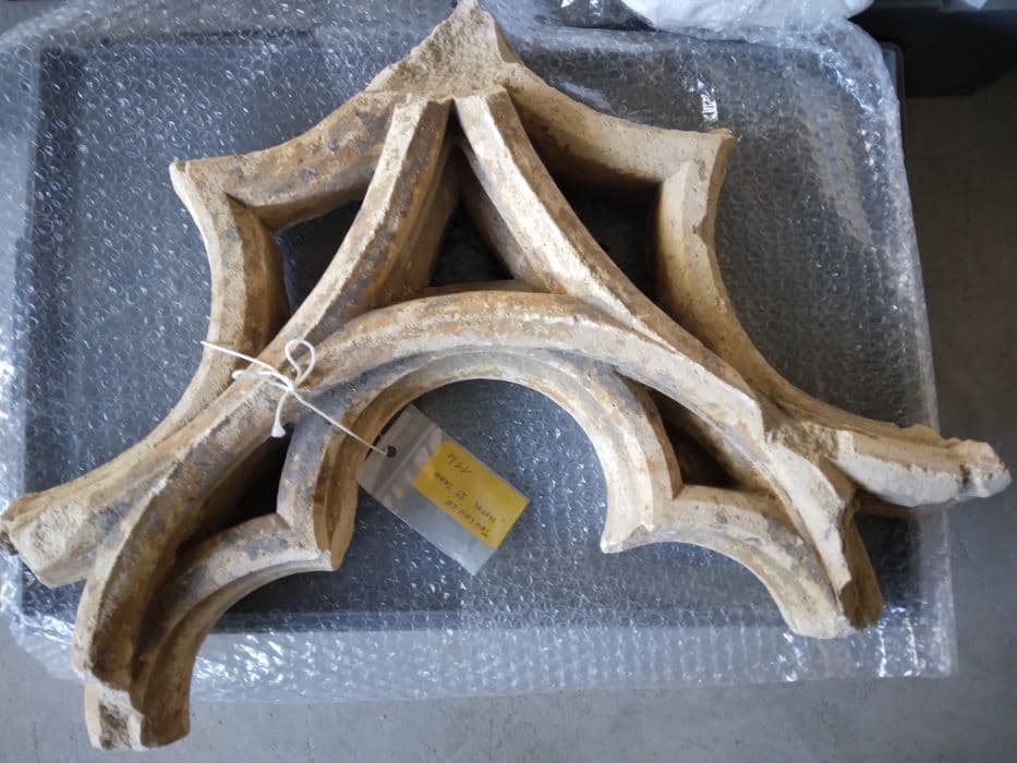 Remplage de baie en pierre calcaire sculptée et polychrome (rouge, jaune et noir).