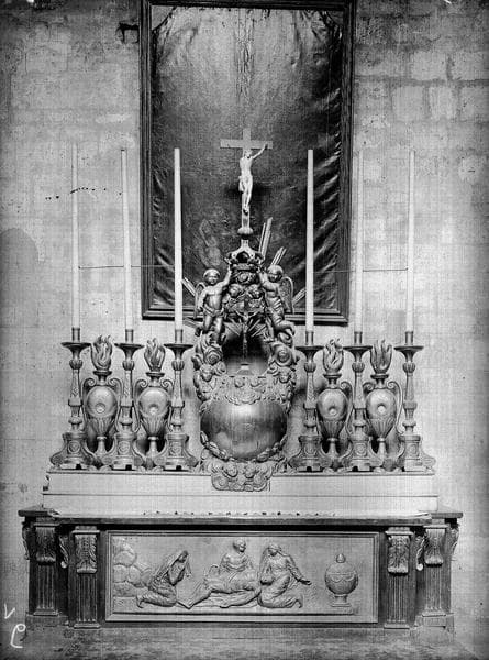 Tabernacle formé d'une boule, de chaque côté de laquelle s'élèvent deux anges, tenant le crucifix. Au-devant du tombeau, une descente de croix.