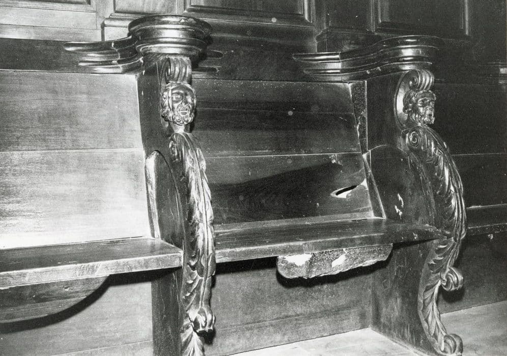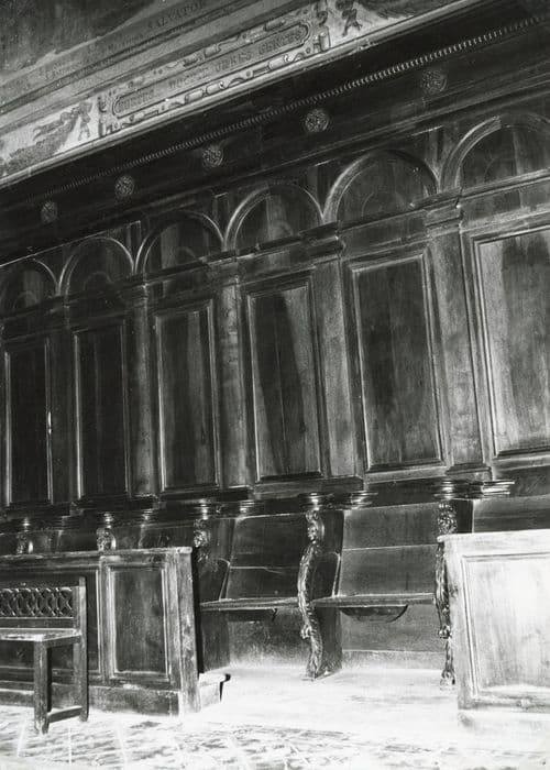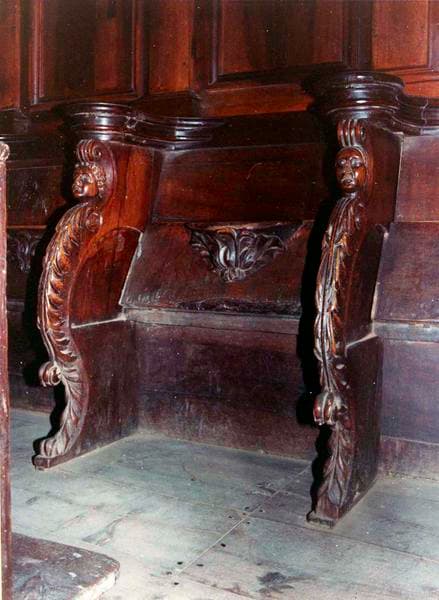 Trente-deux stalles, aux accotoirs ornés de têtes humaines et palmes en volutes, aux miséricordes avec des feuillages ou angelots.