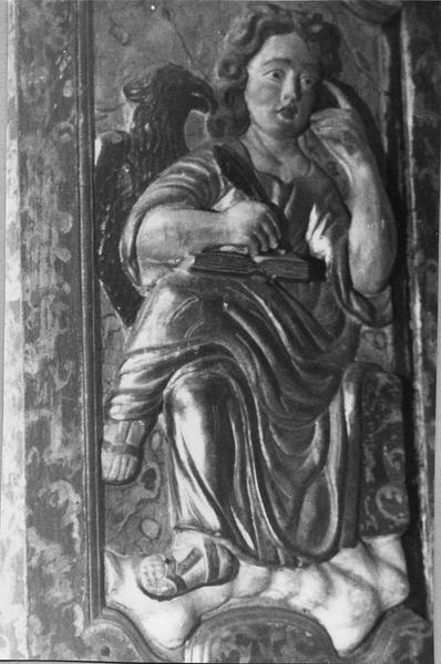 Les quatre panneaux sculptés de la cuve représentent les quatre évangélistes, chacun accompagné de son attribut.