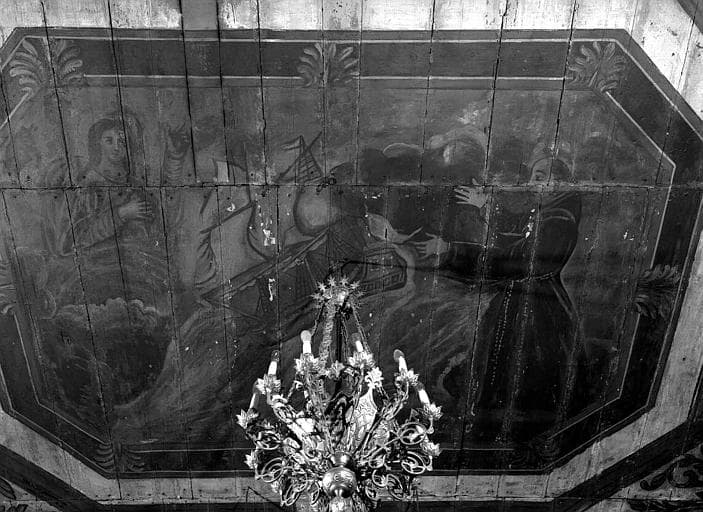 Plafond de bardeaux peints comprenant diverses scènes historiées : Jésus parmi les docteurs, l'Annonciation, le Jugement dernier, la Fuite en Egypte, la Visitation, le Frère Thomas Illyricus invoquant la vierge, tandis que la tempête gronde sur la mer.