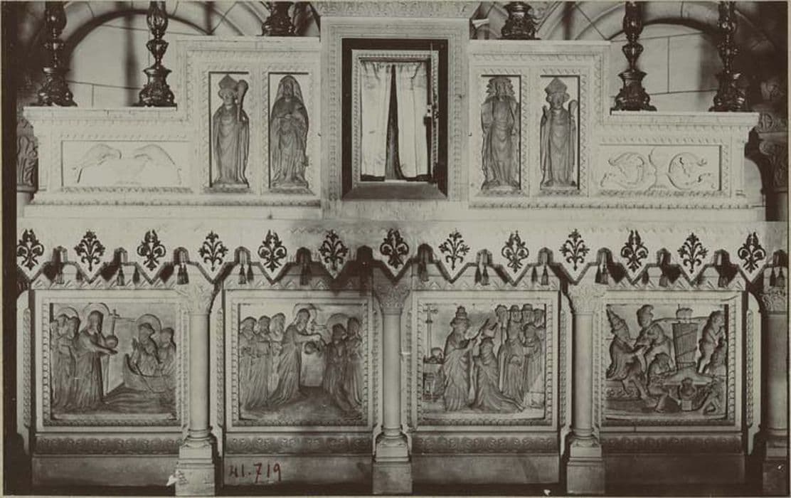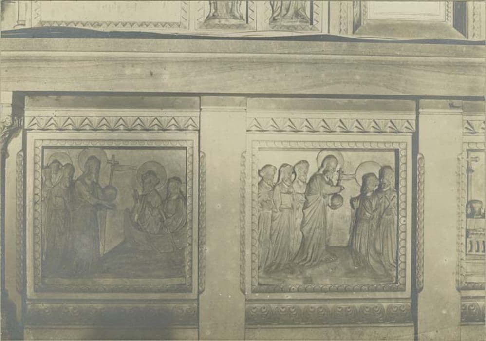 Quatre personnages : saint Jean-Baptiste, saint André et deux prélats. Quatre scènes : Jésus appelle à lui saint Pierre et saint André, Jésus remet les clefs à saint Pierre, sacre d'un évêque par un pape et crucifixion de saint Pierre.