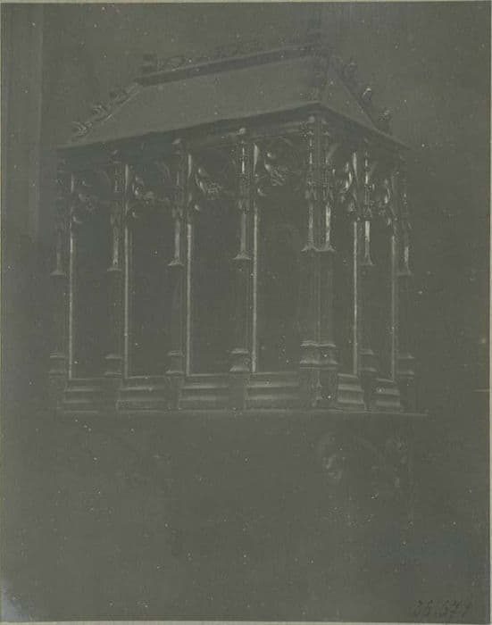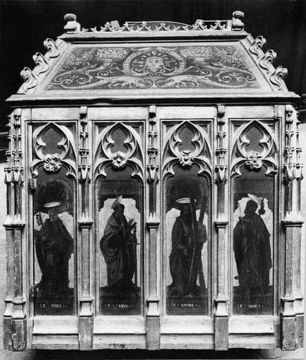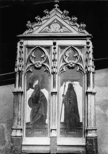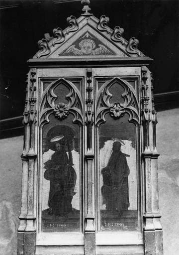 Cette châsse a la forme d'un coffre avec arcature et couvercle en forme de toit. Les arcs et les pilastres sont dorés. Le champ, outre cette architecture, est peint et représente des apôtres dont le nom est peint également.