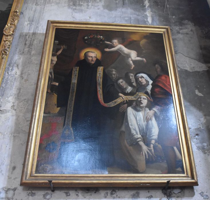 tableau : saint Mommolin guérissant un possédé (ou : Saint Bénédictin imposant un ornement à un possédé)