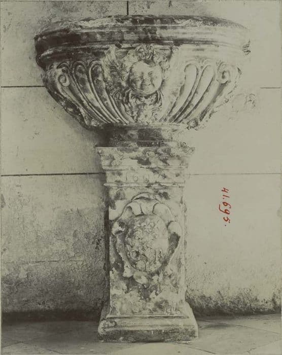Coupe de forme ovale avec des arabesques, une tête d'ange ailé et de longs oves sculptés reposent sur un piédouche carré orné d'un écusson daté de 1609, armoiries G.B. (G. de Birex ?)