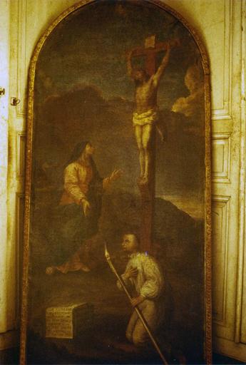 POP | Plateforme ouverte du patrimoinetableau ex-voto : Homme agenouillé devant le Christ en croix, un cierge à la main