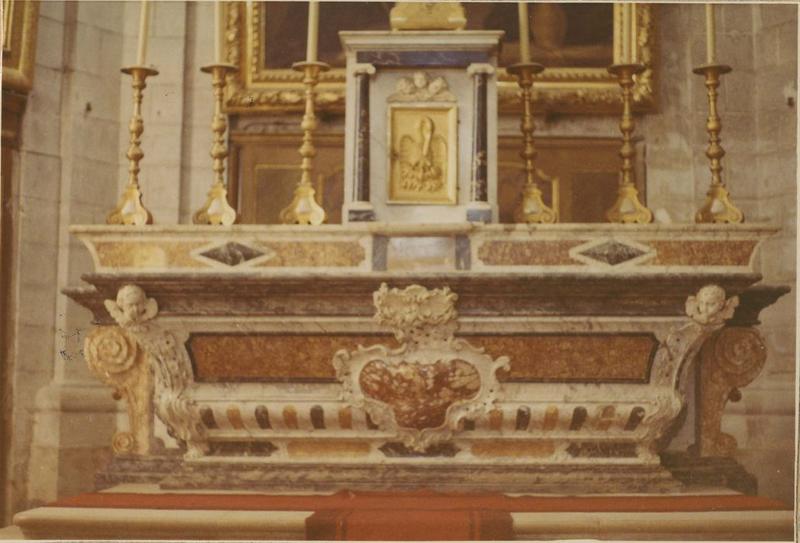 Table tombeau en marbre noir et blanc, cartouche en marbre blanc et jaune, gradins en marbre vert, rouge et noir, tabernacle en marbre blanc et rouge et la porte en bois doré.