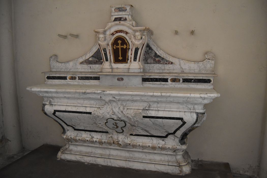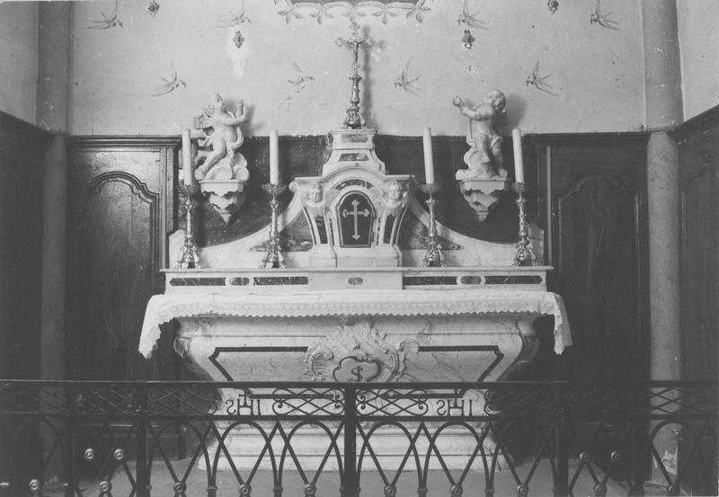 Autel en marbre blanc et marbres de couleur. Autel remonté au 19e siècle avec quelques modifications : porte du tabernacle refaite, ailes amputées.