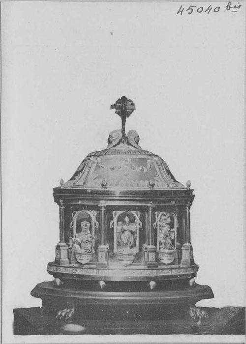 Reliquaire en forme de dôme dont la calotte est surmontée d'une croix.
