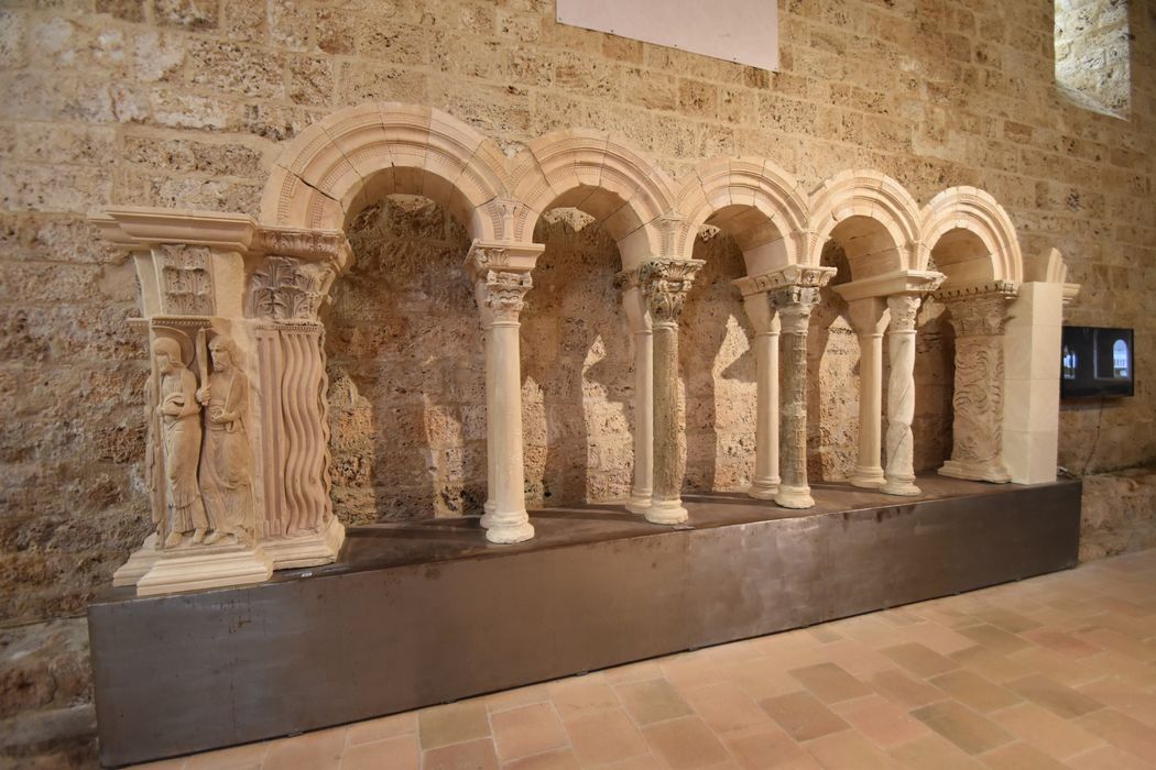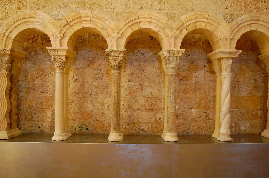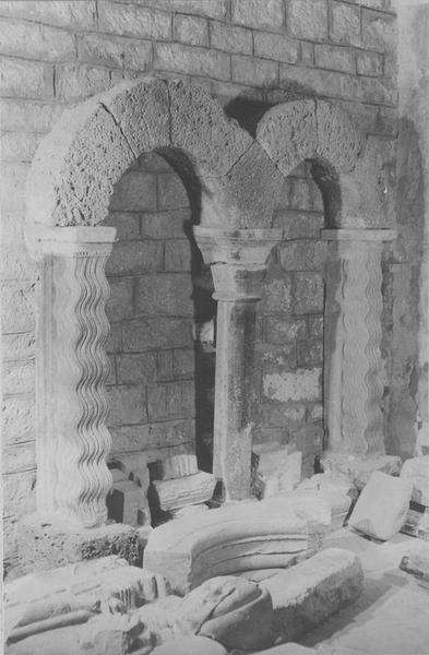 Arc jumelé du cloître composé de deux arceaux reposant sur deux pilastres ondulés, sculptés sur trois faces et sur une colonne octogonale avec sa base et son chapiteau.