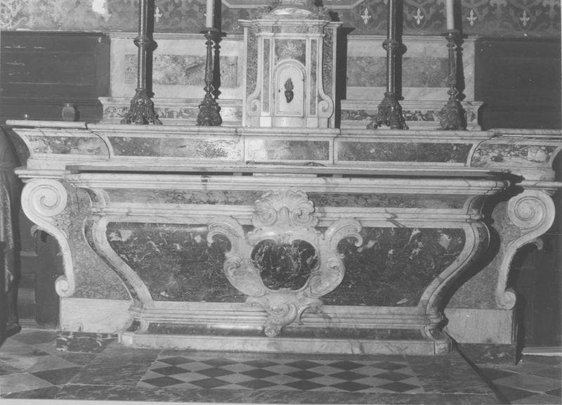 Autel, gradins et tabernacle en marbre blanc, avec panneaux de brèche rouge, jaune, violette. Emmarchement de marbre rouge.