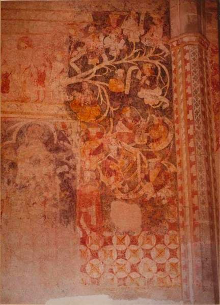 Faux appareil et éléments décoratifs (rosettes, tours, chevrons). Scènes à personnages et pavement décoratif blanc, rouge, jaune et noir.