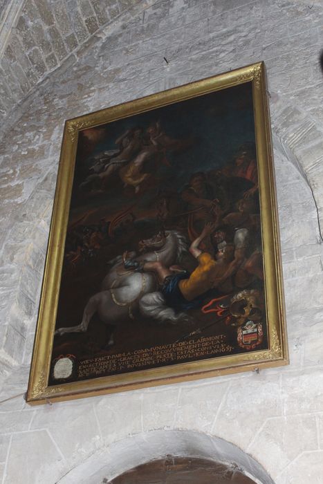 Inscription en bas de la toile, avec armoiries : VOEU FAIT PAR LA COMMUNAUTE DE CLERMONT/EN ACTION DE GRACES DU RECOUVREMENT DE LA/SANTE APRES UNE GRANDE PESTE. EST AS CONSULS/M.R. REY CAL (?) P. POUSSINE ET R. (mot intercalé) St PAUL EN L'AN 1653.