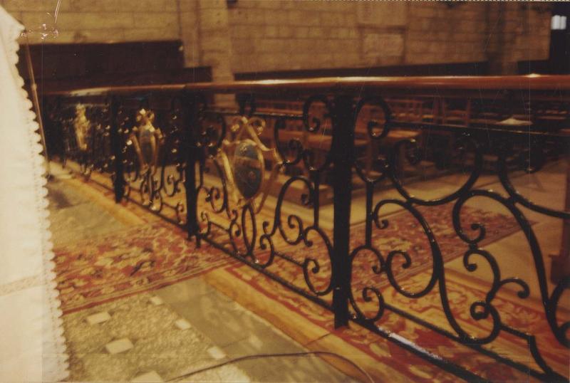 Clôture de choeur en fer forgé avec utilisation de la tôle de fer peinte pour les quatre médaillons des portillons.