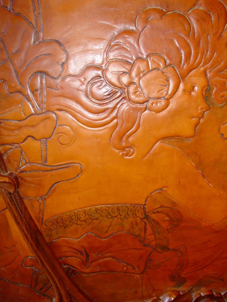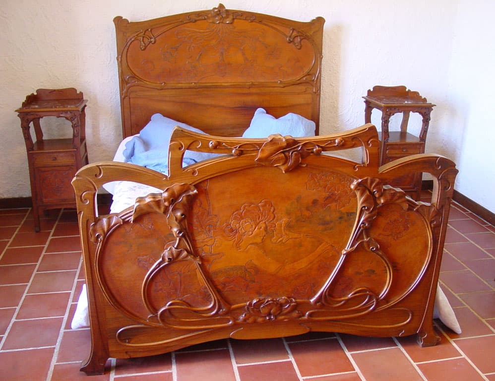 Lit en noyer sculpté de motifs végétaux caractéristiques de l'Art Nouveau. Les chevets sont également agrémentés de pièces de cuir pyrogravé.