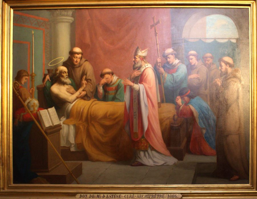 Huile sur toile représentant siant Fulcran sur son lit de mort, esquissant le geste de la bénédiction de la main droite vers un autre évêque (probablement son successeur). Il est entouré de moines en prière.