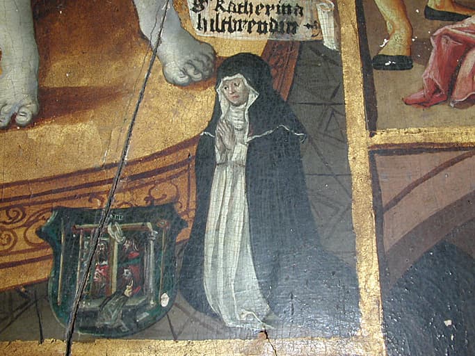 Panneau peint composé d'une scène centrale représentant sainte Agnès couronnée par Dieu le Père et le Christ, en présence du Saint Esprit et d'une sainte, peut-être Pudentienne, la soeur d'Agnès. Cette scène centrale est entouré de douze scènes rectangulaires relatant la vie de sainte Agnès. Le panneau, dont le revers comporte un parquetage fixe, a été aminci lors d'une ancienne restauration.