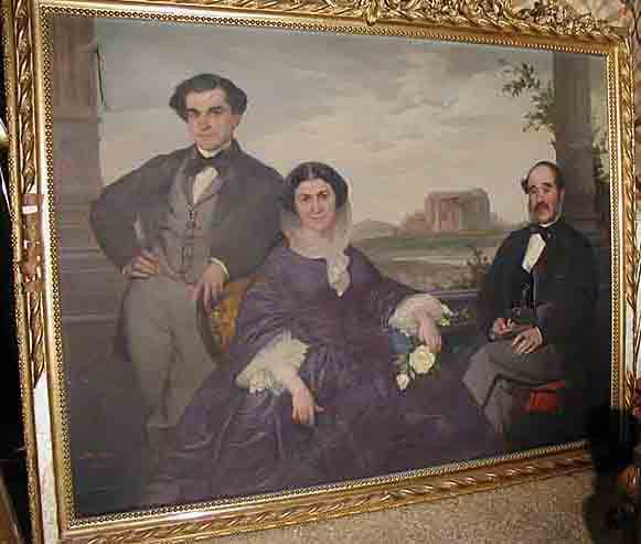 Huile sur toile représentant Monsieur et Madame Fabrège, assis sous une pergola et leur fils Frédéric, debout. On distingue à l'arrière plan la cathédrale de Maguelonne. Cadre en bois à décor de stuc et doré.