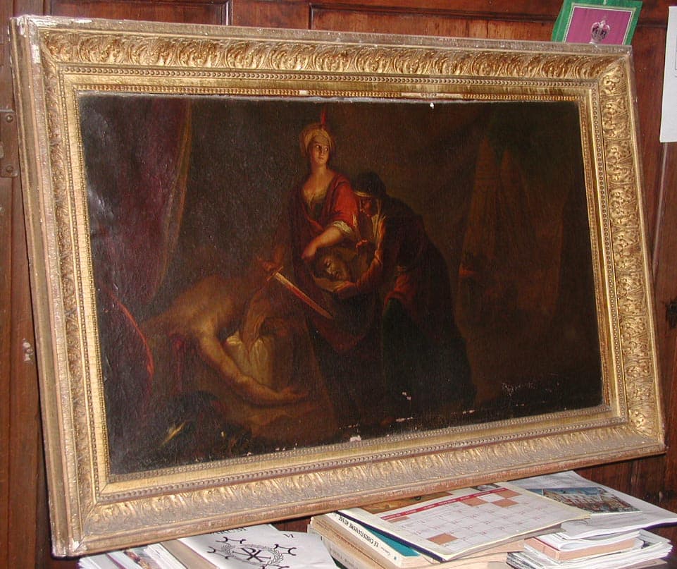 Huile sur toile représentant Judith en train de déposer la tête d'Holopherne, qu'elle vient de trancher, dans le sac que lui tend sa servante.