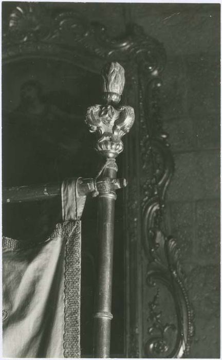 La partie supérieure, ou pommeau, se termine par une flamme dont la base est faite de 3 volutes à motifs rocailles. Les faces de cette base s'ornent d'un motif sculpté en bas-relief représentant d'un côté la colombe du St Esprit, d'un autre la Vierge priant et du dernier un coeur.Deux bâtons sont fixés de part et d'autre de l'arrière-corps du maître-autel. Deux hampes de bâtons de procession servent de tringle pour un tissu servant de fond au gradin de part et d'autre du tabernacle, mais ne semblent pas être comprises dans l'inscription.Un autre bâton du même modèle est conservée dans une vitrine de la chapelle St-Sébastien. Il manque donc un bâton.Si les 4 bâtons de procession ornant le baldaquin des fonts baptismaux sont du même modèle, les motifs qu'ils portent sur le pommeau sont différents.
