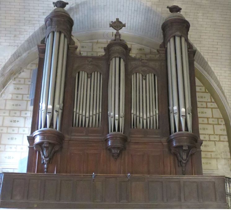 Le buffet, en noyer pour la face avant, en sapin peint en faux-noyer pour les faces latérales et en sapin naturel pour les plafonds, prend appui contre le mur du fond. A l’étage, la façade est organisée en cinq travées, trois tourelles, la plus petite au centre, encadrant deux plates-faces. Les bases des tourelles sont supportés par des culots sculptés. Les parties supérieures sont ornées d’un décor sculpté, les sommets des tuyaux de façade sont masqués par les décors, les tourelles ont des chapeaux surmontés de dômes, portant aux tourelles extérieures des cassolettes et à la tourelle centrale une croix.