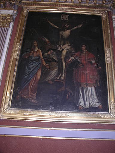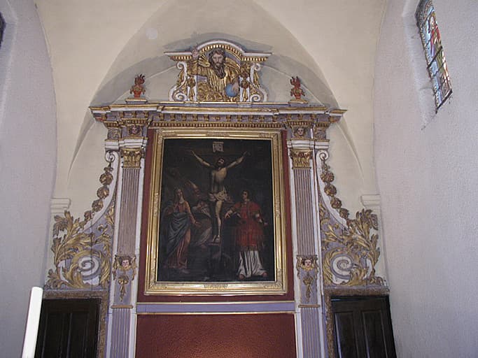 Retable à deux accolades et pilastres à cannelures dorées surmontés d'un chapiteau composite, encadrant une toile avec cadre en bois doré surmontée d'un fronton à chapeau de gendarme dans laquelle se trouve une statue de Dieu le Père bénissant en haut-relief. Les accolades sont ornées de rinceaux dorés et les pilastres, surmontés de pots à feux.