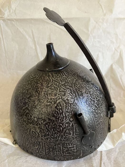 Bouclier de type rondache en fer forgé, orné de motifs de style renaissance avec six bandes portant deux putti et quatre chevaliers dans des cartouches entourés de chutes d'ornements et cuirasses ; casque d'enfant de type indo-persan en fer forgé avec des inscriptions et médaillons figurant des soldats à cheval, ayant perdu toutefois sa pointe et son filet en mailles d'acier ; porte-sabres ou râtelier en bois, fer et velours, pour ranger des armes d'entraînement type fleurets).